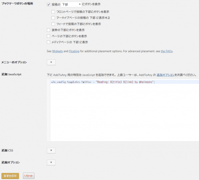 インストール後、有効化するとメニュー 設定の中にAddToAnyが出てきます