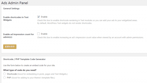 ショートコードやPHPの作成はメニュー画面の設定 Adsから行います