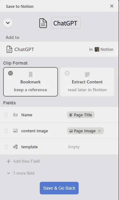 Clip Formatの違いは、BookmarkがNotionのブックマークと同じ扱いで、Extract Contentが保存したいページの本文まで格納してくれます